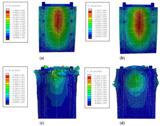 Vertical displacement deformation of the brick wall. (a) MC-1; (b) MC-2; (c) MC-3; (d) MC-4.