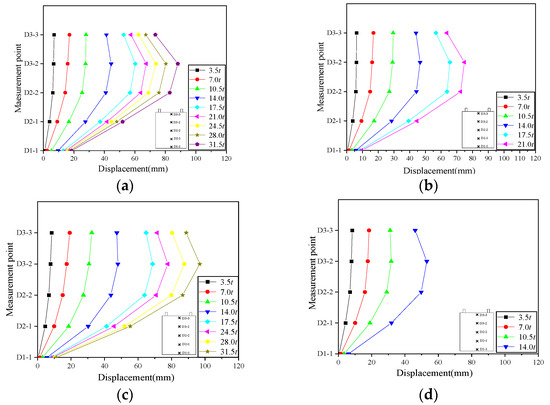 Along the height of the wall, the out-of-plane displacement initially increases and then decreases, with the largest displacement occurring in the middle of the wall, particularly at points D2-2 or D3-2. In Figure 15a, for the models with metal connectors at the top of the wall, the deformation at the measuring points before loading is primarily linear, during the later stages of loading, significant nonlinear deformations is observed in the wall. This phenomenon indicates that initially the wall does not crack or undergo bending deformation out of plane. As the load increases, the out-of-plane deformation in the middle and upper parts of the wall becomes consistent, while the out-of-plane displacement at the top of the wall relatively decreases. Therefore, the wall and the timber frame can collaborate, with the beams restraining the out-of-plane deformation of the top of the brick wall, limiting its deformation.