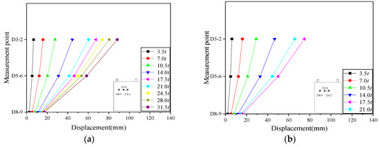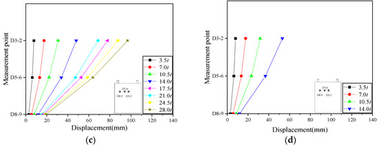 The timber frame restrains the brick wall, resulting in significant differences in the deformation characteristics between the central wall and the wall near the columns. Consequently, the lateral displacement of the central brick wall under different conditions in the horizontal direction is recorded separately. The lateral displacement of the brick wall in the horizontal direction is shown in Figure 16. Taking the lateral displacement of the D8-9 measuring point on the wall near the column as the research object, the maximum lateral displacement Δv and the rate of the increase in the maximum lateral displacement η at the D8-9 measuring point for each specimen are shown in Table 9.