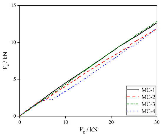 The timber frame and the brick wall represent two different lateral resistance components. During loading, both components undergo damage, influencing changes in the column head force. The force measured at the column head is denoted as the column head shear force (Vc), while the horizontal distributed load on the wall surface is represented as Vg. The relationship (Vg–Vc) for each specimen is shown in Figure 17.