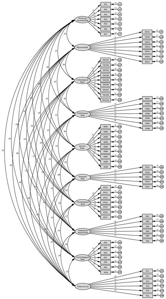 Based on the results of the exploratory factor analysis, a confirmatory factor analysis (CFA) was used to evaluate the perceived risk scale, which included 76 items.
