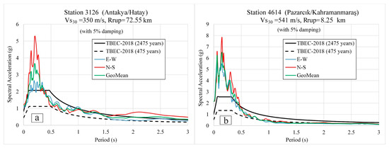 Response spectra compared with TBEC-2018 at stations (a) 3126 and (b) 4614, in relation to the Pazarcık earthquake (Mw = 7.7).