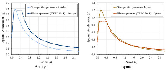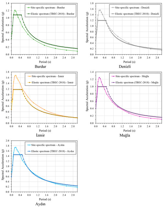 The earthquake performance of buildings provides information on whether the building is safe to use in terms of life safety. Buildings that do not provide the target performance level should be strengthened or demolished. Therefore, it is very important to use the most realistic elastic spectrum curves in these analyses in order to obtain earthquake performance results of buildings that are as close as possible to the behavior of the buildings in a possible earthquake. However, the 6 February 2023 Kahramanmaraş earthquakes clearly showed that the elastic spectrum curves in TBEC-2018 are insufficient to represent the earthquake behavior [32,33,34,35]. This study presents site-specific spectrum curves that can be used in earthquake performance analyses in the provinces located in the southwestern Anatolia region of Türkiye.