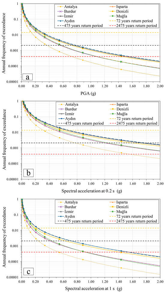 The seismic hazard curves were created for the urban areas of Antalya, Isparta, Burdur, Denizli, İzmir, Muğla, and Aydın located in the southwestern region of Türkiye. The curves obtained depict the annual frequency of exceeding certain levels of peak ground acceleration (PGA) and spectral accelerations at periods of T = 0.2 and T = 1.0 s specifically for ZD sites. The hazard curves presented in Figure 6 incorporate the combined effects of all seismic sources within the region. The municipalities of Aydın, İzmir, and Denizli have been shown to possess notably heightened levels of seismic hazard and demonstrate relatively greater vulnerability to seismic risk in comparison to other municipalities in the region.