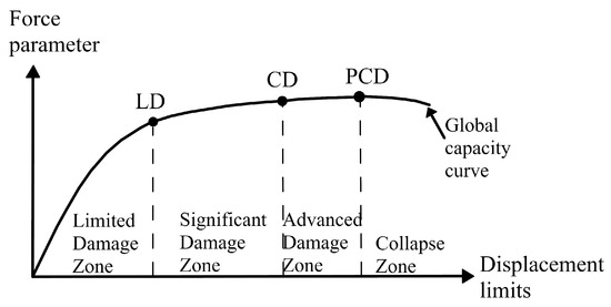 At the cross-section level, TBEC-2018 sets out three damage states and damage limits for ductile elements. These are limited damage (LD), controlled damage (CD), and pre-collapse damage (PCD) and their limit values. Elements whose critical section damage does not reach LD are in the limited damage zone (LDZ), elements between LD and CD are in the significant damage zone (SDZ), elements between CD and PCD are in the advanced damage zone (ADZ), and elements exceeding PCD are in the collapse zone (CZ) (Figure 7).