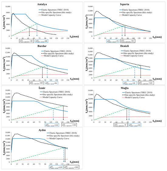The minimum target performance level of reinforced concrete buildings differs according to the purpose of use of the building. According to TBEC-2018, residential buildings must meet the target performance level of controlled damage performance level (CDPL) for earthquakes with a return period of 475 years. Therefore, the spectrum to be used in determining the target displacement of the building should be the spectrum determined for earthquakes with a return period of 475 years. The determination of the target displacements for each province according to both the TBEC-2018 and the site-spectrum curves obtained on a province basis is given in Figure 11 on the same graph. The slope of the initial tangent shown in green in the graphs was calculated as the square of the dominant angular frequency of the model building (⍵2). The initial tangent drawn from the modal capacity curve is intersected by both spectrum curves. Thus, the modal displacement according to TBEC-2018 () and the modal displacement according to the site-specific spectrum () were found for each province separately (Figure 11).