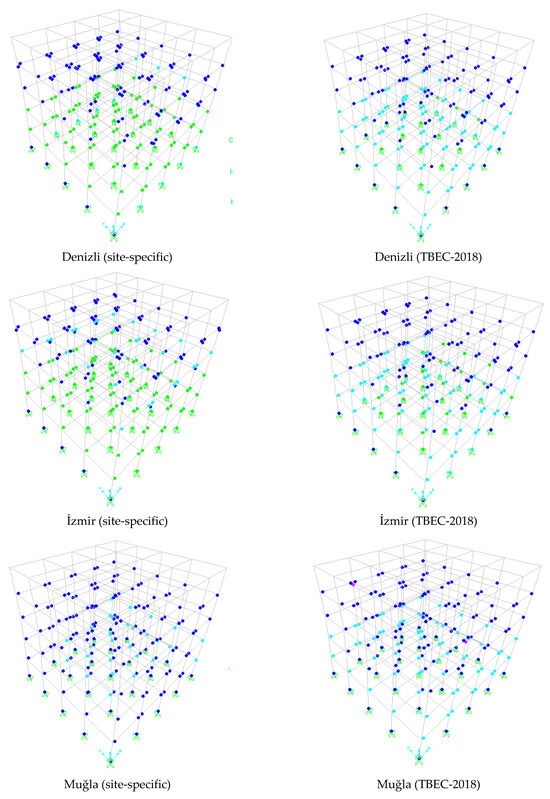 The model building was subjected to static pushover analysis up to the target displacement values obtained according to both TBEC-2018 and site-specific spectra for each province within the scope of the study, and the damage occurring in the structural elements was obtained (Figure 13). The pink-colored plastic hinge in the structural elements in this figure shows that the damage in the cross-section remains in the limited damage zone (LDZ), the blue-colored plastic hinge shows that the damage in the cross-section remains in the significant damage zone (SDZ), the turquoise-colored plastic hinge shows that the damage in the cross-section remains in the advanced damage zone (ADZ), and the green-colored plastic hinge shows that the damage in the cross-section remains in the collapse zone (CZ).