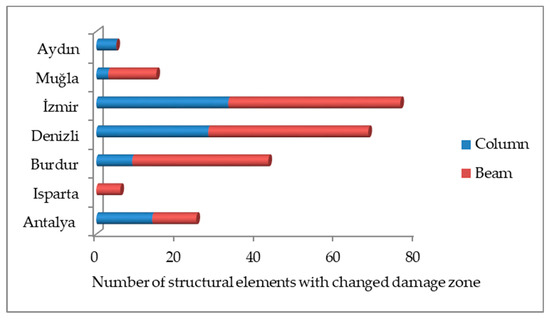 Figure 14 shows that the number of structural elements whose damage zone changed due to spectrum change was the highest in İzmir and the lowest in Aydın. Damage zones of 33 columns and 43 beams changed due to spectrum changes in İzmir.
