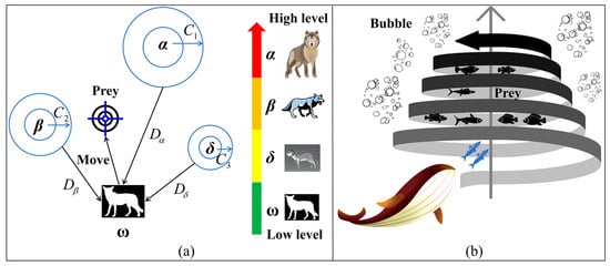 Grey wolf optimization (GWO) [57,58] simulates grey wolves’ social behavior by mimicking their hunting and leadership patterns. Grey wolves can be divided into four species, with the Alpha (α) wolf serving as the pack leader, followed by Beta (β) and Delta (δ) wolves, while Omega (ω) wolves are at the bottom of the food chain (Figure 3a).