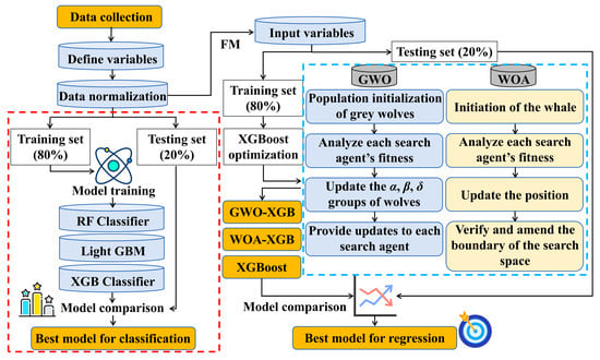 As part of the process of developing a ML-based model for classification, the following steps should be followed: (1) preparation of data with input variables; (2) normalization of data; (3) in this study, the data set has been divided into two types: a training set (80%) and a testing set (20%); (4) training has been conducted using three standard machine learning models (RF, LightGBM, and XGBoost); (5) selecting the most accurate classification model; (6) obtaining the results of the prediction for the testing set. The actual FM is used as an input variable in the development of hybrid optimized ML algorithms (GWO-XGBoost, WOA-XGBoost) that can be used to assess the impact of different failure modes on punching resistance capacity (Figure 4). Following Figure 4, the best regression models to punching shear resistance have been developed for slab-column connections with shear reinforcement. The optimized parameters for regression models are also shown.