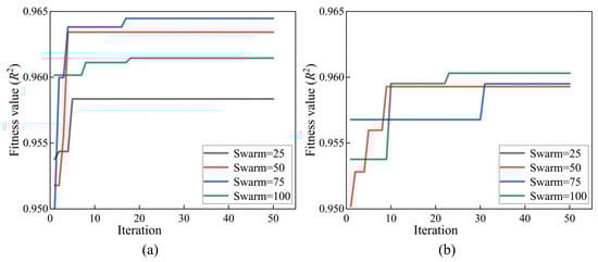 A comparison of the convergence curves of the hybrid algorithms (GWO-XGBoost and WOA-XGBoost) is shown in Figure 6. According to the results, the WOA-XGBoost model performed better during training (Swarm = 75, R2 = 0.9645 in Figure 6a). Despite similar shapes, convergence curves for the WOA present a faster rate of convergence. The WOA achieves the best comprehensive performance not only during training, but also during the testing of MAE, RMSE, and R2. Table 3 lists the main parameters of regression models.
