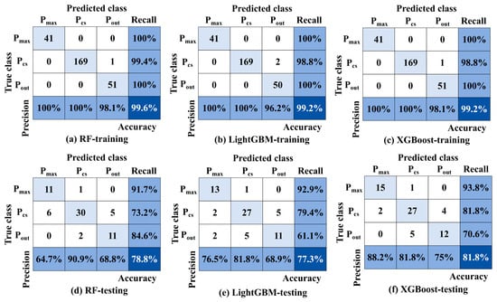 The results indicate that XGBoost classifier had the highest accuracy rate, and that its precision and recall were also the highest in the training and testing datasets. According to the test results, Pmax, Pcs, and Pout have precisions of 88.2%, 81.8%, and 75%, respectively, and recalls of 93.8%, 81.8%, and 70.6%, respectively. Almost all of the failure modes are correctly classified in the training process. According to the bottom right corner of the diagram, the XGBoost classifier achieves an accuracy of 81.8%, which is better than RF and LightGBM. This may be due to the fact that the objective function and row and column sampling technique in XGBoost are designed to prevent overfitting. The branching metric is reset to a gain in structure score when the growth direction is more straightforward. While LightGBM is intended for large datasets, it is extremely sensitive to overfitting in small datasets. Figure 7 indicates that the recall for predicting the failure modes of Pcs and Pout is lower than that for Pmax, primarily due to the complex mechanism of the Pcs and Pout and the differences between them during the testing not being well defined, which requires additional investigation.