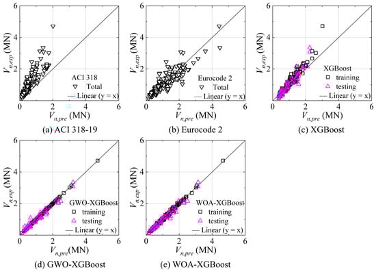 Comparison with existing methods: (a) ACI 318-19; (b) Eurocode 2-2004; (c) XGBoost; (d) GWO-XGBoost; (e) WOA-XGBoost.