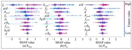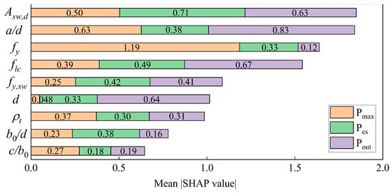 The SHAP theory was used to determine the sensitivity of the variables affecting types of failure. Figure 9 illustrates the importance of input variables through a visual representation, and each variable contributes to a varying degree to the prediction. It provides additional information regarding slab failure modes that has not previously been examined. Previously published studies [11,20,22,48] focused more on global failure mode than on individual classes (Pmax, Pcs, or Pout). According to Figure 9, and have been found to be the two variables that are of highest importance in all three types of failures. There is a significant impact of on the failure mode Pmax, while its effect on the two other failure modes is relatively minimal. The failure mode Pout is significantly influenced by , whereas its impact on the other two failure modes is relatively limited. These two parameters can also be used to determine a simple indicator of different failure modes.