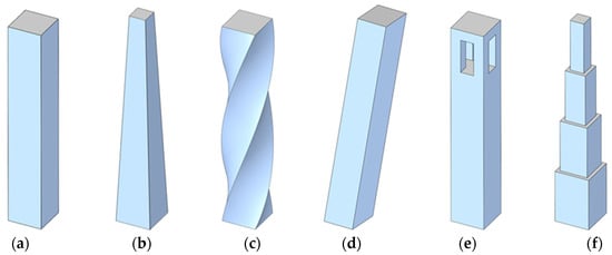 There are two approaches: corner (minor) modification and outer shape (major) modification for aerodynamic optimization. Major modification of buildings not only facilitates access to natural light and enhances aesthetics but also provides more flexible usage space [5]. Currently, major modification is the primary strategy for mitigating wind force effects on high-rise buildings [6,7], such as tapered, helical, inclined, opening, and set-back buildings (see Figure 1). Cooper et al. [8] have studied the wind effects on tapered buildings through wind tunnel tests, and their results show that tapered measures could diminish cross-wind aerodynamic forces. Kim et al. [9] have conducted wind tunnel experiments using a rocking vibration model to investigate the aerodynamic damping of a 180° twisted super-tall building. It was shown that the helical model exhibited superior aerodynamic behaviour compared to the square model. Chen et al. [10] have evaluated the aerodynamic characteristics of an inclined square prism through wind tunnel tests and Large Eddy Simulation (LES). The results showed that the inclination could suppress the vortex shedding of the building. Wind loads and wind speed amplification on high-rise buildings with openings were investigated by Chen et al. [11]. The results show that the opening could lessen the wind load in the along-wind direction.