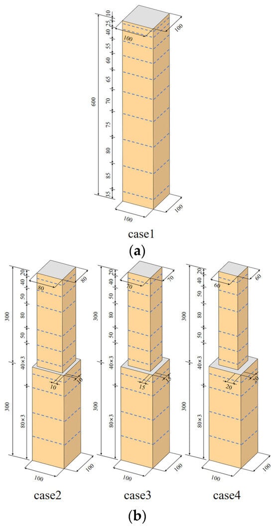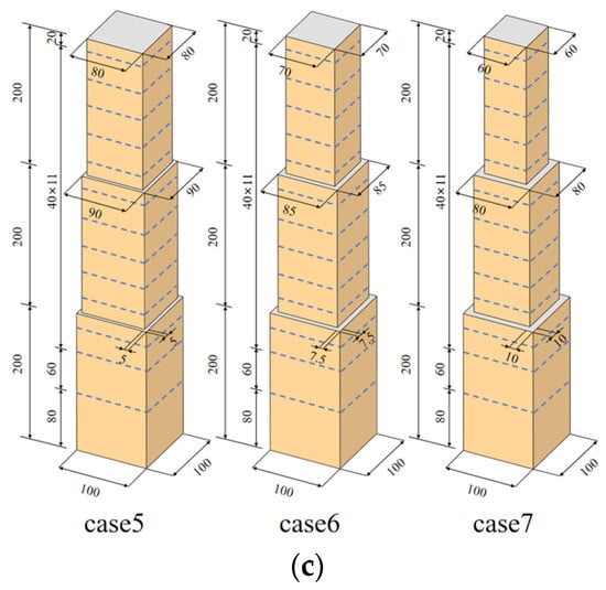 To facilitate comparison with the results from the existing wind tunnel test, the scale ratio of the numerical model was set to 1:500. Seven high-rise building models, categorized into two groups with an identical ratio of depth (D), width (W), and height (H) 1:1:6, were studied. The benchmark model is a rectangular block with D = 100 mm, W = 100 mm, and H = 600 mm (see Figure 2a). The first group (Group 1) comprised three single set-backs (case 2, case 3, and case 4); the height of the set-back was H/2, and the edges of set-back were distanced at 0.1D, 0.15D, and 0.2D far from the edge of base, respectively (see Figure 2b). Similarly, the second group (Group 2) encompassed three double set-backs (case 5, case 6, and case 7). The heights of the two set-backs were H/3, with the edges of the first set-back at 0.05D, 0.075D, and 0.1D far from the edge of base, and the edges of the second set-back were at 0.05D, 0.075D, and 0.1D far from the edge of the first set-back, respectively (see Figure 2c).