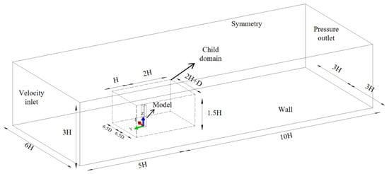 The dimensions of the computational domain were set as 6H × 15H × 3H, and the origin coordinate was positioned at the bottom centre of the model, as shown in Figure 3. The distance between the inlet and the model centre was 5H, and the distance between the outlet and the model centre was 10H. In addition, the model centre was 3H away from both the lateral and top sides. In the numerical simulation, the blockage rate was set to not exceed 5%, which is in accordance with the requirement of specification [25].