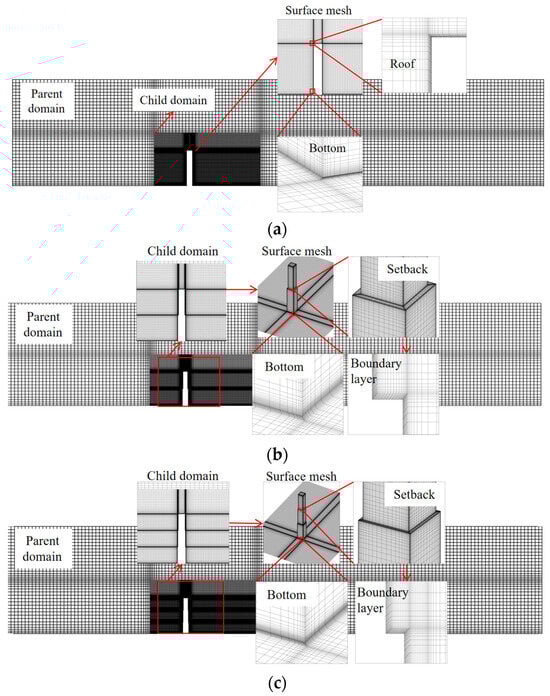 The computational grid was fully structured. A child domain with a stretching ratio of 1.05 was constructed around the model to enhance the accuracy and trace small eddies [26]. The dimensions of the refined mesh region were (2H + D) × 3H × 1.5H, and the height of the first mesh cell of the surface was set as 8.00 × 10−5 m. The details of the mesh arrangement of the benchmark model, single set-back model, and double set-back model can be found in Figure 4.