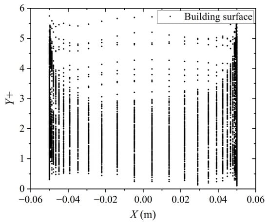Figure 5 displays the distributions of Y+ values on the surface of the benchmark model, and it can be found that most of the Y+ values on the surface are below 5, satisfying the requirement for LES [27]. For the set-back building models, the minimum mesh scheme comprised 3.3 million cells within the computational domain.
