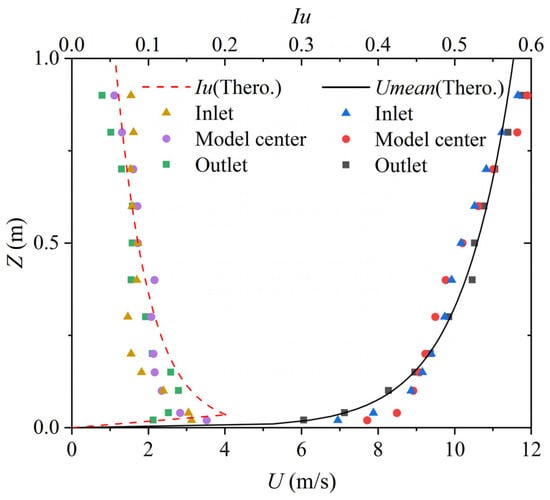 Figure 6 presents a comparison of the wind profile from inlet, outlet, and the cross-section at the centre of the model obtained from the empty computational domain, with the results calculated by Equations (1) and (2). The numerical simulation results demonstrate a strong correlation with the theoretical values, which indicates that the atmospheric boundary layer has a good self-sustaining ability. Consequently, the proposed LES model is capable of simulating the wind field around set-back tall buildings.