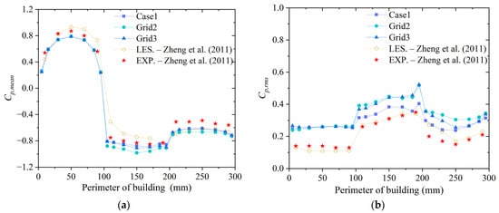 Two additional grid types, with the thickness of the first layer boundary mesh of 5.00 × 10−5 m and 1.00 × 10−4 m, were selected for grid sensitive analysis to verify the resolution of the model. When the mesh sizes did not exceed 8.0 × 10−5 m, the results of numerical simulation were close. To assess the accuracy of the proposed models, the results of benchmark model (case 1) were compared to that of the wind tunnel test performed by Zheng et al. [28]. It can be observed that the mean wind pressure coefficient Cpi,mean obtained from the LES exhibits strong concordance with the experimental results (see Figure 7a). The fluctuating wind pressure coefficient Cpi,rms obtained from the LES is slightly larger than that from the wind tunnel test (see Figure 7b). Nevertheless, all the curves display a consistent trend, suggesting that the proposed LES models are dependable for evaluating the aerodynamic performance of set-back tall buildings.