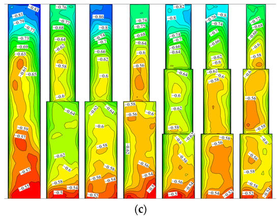 Contour of mean wind pressure coefficients on the surface for the proposed building models: (a) windward; (b) sideward; (c) leeward.