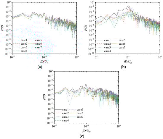 The time history of the base moment coefficients can be converted into power spectral densities (PSDs) by using Fourier transform; thus, the variation in the wind effects of the proposed building models in the frequency domain can be examined. Figure 10 illustrates a comparison of the PSDs of base moment for the proposed building models in the along-wind, cross-wind, and torsional directions, in which the ordinate denotes the power spectral densities and the abscissa denotes the reduced frequency. It can be found in Figure 10a that the spectrum exhibited broadband characteristics without obvious peaks for all building models in the along-wind direction. Figure 10b shows that the PSDs diminished with the increase in the length of set-back for both of the two groups of set-back building models, with the maximum peak of the spectrum at 0.128 occurring in case 1 and the minimum peak at 0.009 occurring in case 7. The spectrum of the set-back building models developed from narrowband to broadband, while the spectrum of the benchmark model maintained narrowband characteristics in the cross-wind direction. This indicates that the periodic vortex shedding of set-back buildings was suppressed, leading to a more irregular vortex shedding process. In addition, with the increase in the set-back length, the reduced frequency of the peak spectral energy became higher and the vortex shedding frequency increased. It can be observed in Figure 10c that the spectral energy of the building models was not affected by set-back measures in the torsional direction, indicating that the spectral energy of the building models in the torsional direction was negligible compared to that in the along-wind and cross-wind directions.