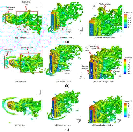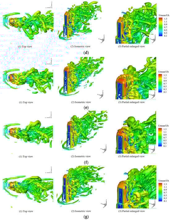 Typical diagrams of three-dimensional transient vortex structures around the proposed building models: (a) case 1; (b) case 2; (c) case 3; (d) case 4; (e) case 5; (f) case 6; (g) case 7.