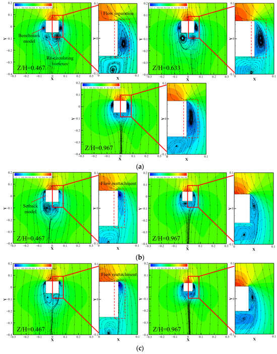 In order to obtain the time-averaged flow field of the representative plane, the X–Y horizontal planes at Z/H = 0.467, 0.633, and 0.967 were extracted from the benchmark model. Similarly, the X–Y horizontal planes at Z/H = 0.467 and 0.967 were obtained from Group 1, and the X–Y horizontal planes at Z/H = 0.633 and 0.967 were derived from Group 2. Figure 12 shows the streamline diagram of the mean velocity of the proposed building models at different horizontal planes. It can be observed that the inflow reached the windward surface first and spread to both sides, and then the flow separated at the leading edge of the sideward surface. Finally, a pair of symmetrical swirling vortexes were generated in the wake region of the model on the leeward. The streamline at the height of Z/H = 0.967 for the building models adhered to the leeward surface due to the influence of the three-dimensional vortex.
