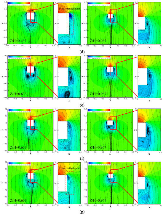 Streamline diagram of mean velocity of the building models at different horizontal planes: (a) case 1; (b) case 2; (c) case 3; (d) case 4; (e) case 5; (f) case 6; (g) case 7.