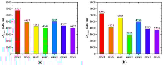 In order to obtain MD,max, the first-order and second-order inherent frequencies were set as 0.16 Hz, and the structural damping (ζ0) was chosen as 3.5%. The base peak dynamic moments of the proposed building models (case 1–case 7) in both the along-wind and cross-wind directions can be found in Figure 13a and Figure 13b, respectively.