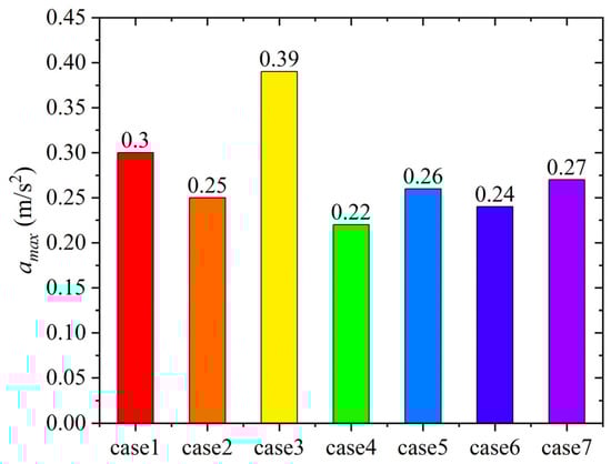 It can be found from Figure 14 that the top peak acceleration response of case 3 was 30% larger than that of the benchmark model in the cross-wind direction due to VIV, which might severely impact human comfort. Meanwhile, the effects of the set-back measures on the top peak acceleration response of the other cases (case 2, 4, 5, 6, 7) in the cross-wind direction were limited.