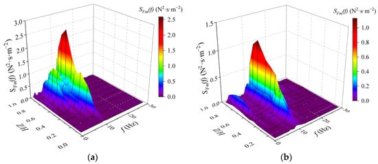 Figure 15 illustrates the distribution of PSDs of Fm and SFm(f) along the height of the proposed building models in the cross-wind direction. The peak spectral energy for Group 1 was observed at 0.82 H, 0.82 H, and 0.40 H, while for Group 2, it appeared at 0.83 H, 0.50 H, and 0.43 H, respectively. This indicates that the dominant aerodynamic forces occurred at the middle-upper part of the set-back building models. Hence, additional local aerodynamic optimization needs to be adopted in the corresponding positions to avoid VIV. Furthermore, according to Figure 15d,g, increasing the length of set-back could reduce the probability of the occurrence of VIV. This is attributed to the vortex shedding frequency of the wake becoming disordered when the energy spectrum was divided into two parts.