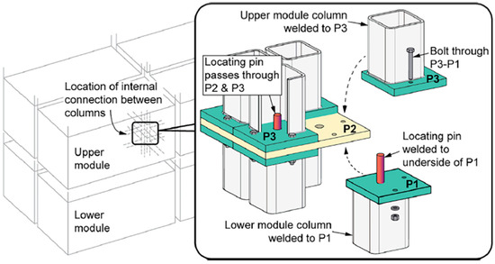 Researchers and engineers have recently paid more attention to modular buildings’ IMCs. Extensive state-of-the-art literature studies on the structural performance of IMCs were conducted in [8,11,14,16,17,18,19,20,21,22,23,24,25,26,27,28,29,30,31,32,33,34,35]. While the internal area between the adjacent modules is still the most prone, various (internal) inter-module connection techniques have been proposed in the available literature that aim for easy and fast installations using bolted shear keys, plates, grouts, etc. [10,28,36,37,38,39,40,41,42,43,44,45]. Generally, the two forms of IMCs are horizontal and vertical connections, where the floor beams of the upper modules and the ceiling beams of the lower modules are connected horizontally; the vertical connection for corner support modules involves joining the upper module to the lower module at the corner columns. Corfar et al. [46] classified the IMCs into three main groups, as shown in Figure 1. The most common method for connecting the top and lower modules involves shear keys with gusset plates or fastened gusset plates [47,48]. Lacey et al. [20] introduced an adapted connection that combined bolt-and-plate connections with the interlocking action of pins, as shown in Figure 2. In contrast, the pre-welded locating pins improved the site installation of units; significant slippage was inflicted upon the connection due to the manufacturing tolerances in the bolt and pin holes.