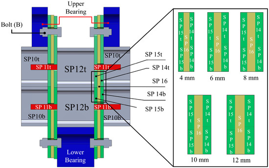 Inter-module connections (IMCs) are critical because they maintain the modular building’s structural robustness and general stability [10,67]. Similarly to the Lacey et al. [20] work, the plates are labelled (SP14, SP15, and SP16) for convenience in the following discussion where (SP) refers to Single Plate, (t) and (b) refer to the top and bottom of the assembled specimen. Their study selected sample (A) as the control model for this study and labelled it as (A0). The connection design focused on the interplay between (SP14, SP15, and SP16); the connection geometry shown in Figure 3 captures the full and cut-way view to present the hidden connection components and the connection dimensions specified in Table 1.