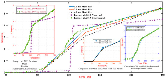 Comparative analysis between force-slip Lacey et al. [20] experimental approach results and FE model mesh size results.