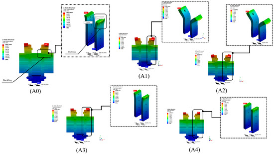 The deformation and buckling in the connection cases of the varying plate thickness and their impact on the connection stability are shown in Figure 10. The controlled model (A0) showed mid-plate buckling, particularly in the 8 mm (SP14) plate, top and bottom regain, tension at the upper bolt holes, and steel exposure near the upper bearing, indicating structural vulnerabilities. Halving the thickness to 4 mm, as in case (A1), exacerbates buckling and tension increase, reflecting the reduced capacity of thinner plates to maintain structural integrity under standard loading conditions. However, it is crucial to acknowledge the uncertainties that might arise when these models are subjected to different loading scenarios, such as seismic or combined axial, lateral, shear, and torsional. A moderate improvement is seen in case (A2), reducing buckling relative to (A1), but it still suffers from notable tension and buckling, indicating improvement requirements. A marked enhancement in the connection resistance is observed in case (A3), where 10 mm plates minimise deformation with a reduction in buckling and tension. The most substantial resistance to buckling is achieved in case (A4), where the thickest plates exhibit the best minor deformation, minimal buckling, tension, and reduced steel exposure.