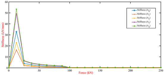 Figure 19 shows the linear regression analysis for stiffness attributes case (A0 through A4) plotted against the applied force. The analysis reveals indication of a negative slope across all the attributes; in case (A0), the intercept is at 7.082 kN/mm, and the stiffness decreases with increasing force, shown by a slope of −0.0379, while in case (A1), started at an intercept of 4.5187 kN/mm, with a gentler decline in stiffness as the force increases, indicated by a slope of −0.0188; in contrast, case (A3) gained at a higher intercept of 10.572 kN/mm, has a more pronounced decrease in stiffness for increased force, as the slope is −0.0565. Finally, case (A4) has a higher intercept at 11.48 kN/mm and the steepest negative slope of −0.0614, indicating the most considerable decrease in stiffness with force among the attributes. The R-squared value for all the attributes is the same (0.1724), indicating that the force explains a small portion of the variability in stiffness and that other factors might also significantly influence stiffness, such as material properties, geometry, load distribution, ageing wear, strain load, defect, etc.