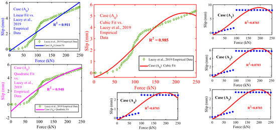 Equation (6) captures the essence of the slip prediction model, where (∆) denotes the slip, (F) represents the applied force, and (an) through (a0) are the coefficients that define the curve’s shape based on the degree (n) of the polynomial. These coefficients are critical as they embody the model’s sensitivity to changes in force, enabling the prediction slope with varying degrees of applied forces. The development and implementation of this model were carried out in MALATAB R2022b. This included generating a comprehensive set of force values within the specified range and applying the polynomial coefficients to predict slip outcomes. The process began by defining a vector encompassing 1000 evenly spaced force values between 0 and 250 kN to cover a broad spectrum of potential scenarios. Specific polynomial coefficients were established based on predefined equations for each model variant (A0 through A4). These coefficients are instrumental in delineating the model’s predictive accuracy and were selected to mimic closely the empirical data observed in slip phenomena. Using MALATAB R2022b’s ‘polyval’ function, the polynomial equations were evaluated for each force value, facilitating the slip prediction across the range of applied forces. This pivotal step transforms theoretical constructs into practical, predictive insights that accurately reflect the slip behaviour under various force conditions.