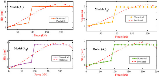 A comprehensive analysis was conducted to quantify the overall performance of the model. The total absolute difference between the model’s predictions and the empirical slip values was approximately 16.30 mm, calculated across all data points, excluding zero slip scenarios, for greater precision. This resulted in an average error rate of approximately 10.80%, indicating a generally commendable level of accuracy in the model’s slip predictions. Further comparisons involved the model’s performance against FE models (A1) through (A4), as detailed in Figure 15. These comparisons revealed varying degrees of accuracy, with the model (A1) exhibiting an average error of about 59.50%, indicating a significant deviation from actual slip values. Models (A2) and (A3) showed slightly better but still considerable error rates of 59.10% and 57.90%, respectively, while model (A4) emerged as the most accurate, with an error rate of approximately 57%. These results underscore the challenges in slip prediction and highlight the potential for refinement in the polynomial regression model’s application.