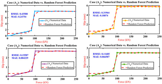 The previous validation approach affirms the model’s efficiency in predicting slip across the range of forces and highlights potential avenues for further refinement. This study delves into deploying a machine-learning model (refer to Appendix C) using the MATLAB R2022b ‘TreeBagger’ function to enhance slip prediction accuracy across various forces. The ‘TreeBagger’ tool employs a random forest regression approach, an ensemble learning method that constructs multiple decision trees during the training phase. This method is renowned for its robustness and flexibility in modelling complex, non-linear relationships without a predefined model structure. Utilising this approach, the study iterated over four sets of slip data (A1 to A4), each employing the applied force as the predictor variable and the corresponding slip values as the response variable. The model was trained for each dataset and subsequently used to predict slip values, plotted against actual data for a visual comparison. Two key metrics were employed to quantify the model’s predictive performance: Mean Absolute Error (MAE) and Root Mean Square Error (RMSE). MAE calculates the average absolute differences between the predicted and actual values, offering a measure resistant to outliers. Conversely, RMSE provides the square root of the average squared differences between predicted and actual values, offering insight into the overall magnitude of the prediction error. A comparative analysis of the model’s performance across the datasets (A1 to A4) revealed that case (A4) exhibited the most favourable outcomes in terms of both RMSE and MAE. This indicates that (A4) had the lowest average error magnitude and demonstrated the highest resilience against outliers. Following (A4), the models’ performance in terms of accuracy improved progressively from (A3) to (A2) and lastly to (A1), as detailed in the results shown in Figure 16. The analysis highlighted a notable overestimation in initial slip predictions for lower forces (0 to 75 kN). However, the model’s predictions for higher forces (above 87.5 kN) closely matched the empirical slip values. For instance, at a force level of 100 kN, the maximum deviation observed was approximately 7%, with the numerical slip at 8.1253 mm and the random forest prediction at 7.193 mm for case (A1). In contrast, for cases (A2) and (A3), the predicted slip values were lower by approximately 11.70% compared to the empirical values at the same force level. In contrast, case (A4) exhibited a slight discrepancy of about 14.80%. In conclusion, the random forest regression analysis, powered by ‘TreeBagger’, underscores the effectiveness of the random forest model in predicting slip across varying forces. This approach highlights the model’s strengths and its potential areas for improvement. The observed trend, starting with an overestimation at lower forces and achieving higher accuracy at greater forces, signals a promising direction towards refining the accuracy of interlocking mechanism models.