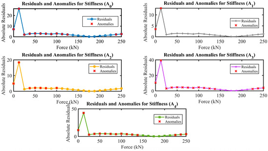 In the context of the study investigation, the anomaly detection approach focused on identifying anomalies through the analysis of residuals derived from linear regression models. This approach is pivotal for elucidating deviations from anticipated linear behaviour across a quintet of stiffness attributes (Stiffness A0 to Stiffness A4) against the applied force range. Employing linear regression, residuals were calculated for each attribute by deducing the difference between the observed values and those predicted by the model. Subsequently, points were identified as anomalies when their absolute residuals surpassed a pre-established threshold. This procedure was instrumental in unveiling a distinct distribution of anomalies across the dataset. As shown in Figure 20, stiffness in the controlled model (A0) presented an extensive array of anomalies, spanning virtually over the entire range of applied forces. This suggests a fundamental non-linearity in the material’s response. In contrast, case (A1) displayed anomalies only at the onset of force application, hinting at potential setup or calibration issues. Case (A2) showed anomalies at scattered force levels, indicating possible specific points of interest in the material’s behaviour under load. Meanwhile, case (A3) and case(A4) exhibited a similar pattern to (A0), with anomalies detected across a broad spectrum of forces, underscoring a need for a deeper investigation into the structural or material properties influencing these observations. In conclusion, analysing residual and anomalies across stiffness attributes provides valuable insights into the expected and potential behaviour of the connection under investigation.
