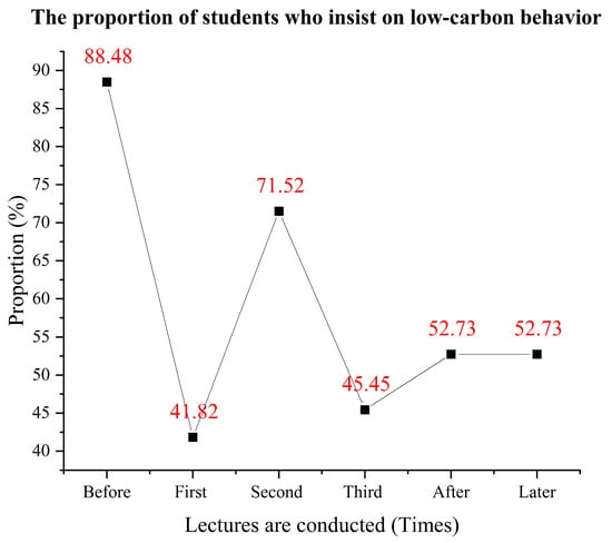 Figure 2). However, as time passed, some students began to ignore related carbon behaviors, and only 41.82% were willing to persist. Within 1–2 weeks of the second lecture, the students’ low-carbon behavior continued to rise, and the rate increased to 71.52%, then slowly decreased to 45.45% over time. After the third lecture, student behavior began to decline after maintaining a slow growth and remained unchanged at 52.73%. Therefore, this study argues that 52.73% of students can adhere to the above-mentioned energy-saving habits, and this ratio is also used as the reduction factor for carbon emission reduction.