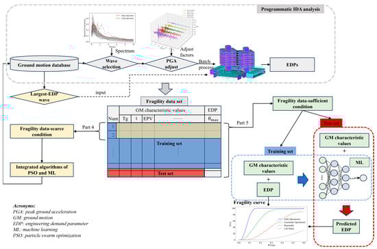 Considering these factors, the present study investigates the application of ML in fragility analysis, introducing an innovative methodology that leverages ML and PSO in both data-scarce and data sufficient scenarios. In the face of scarce data availability, the methodology synergizes PSO with ML algorithms to pinpoint GMs that are likely to induce maximum inter-story drifts. The efficacy of this integrative approach is further evaluated by comparing its selection accuracy for GMs against that of a standalone ML model in a high-rise RC structure. When sufficient data are available, the methodological framework sidesteps the manual pinpointing of critical parameters contingent upon structural typologies. The approach favorably utilizes the characteristic values of GMs to employ a comprehensive suite of machine learning (ML) models. This suite includes the Light Gradient Boosting Machine (LightGBM), developed by Microsoft’s DMTK project team and hosted on GitHub (Microsoft Corporation, Redmond, WA, USA); Gradient Boosting Regression (GBR), which is part of the open-source project Scikit-learn (Paris, France); as well as Long Short-Term Memory networks (LSTM) and Bidirectional LSTM (BiLSTM), which are open-source projects supported by a global community of developers (Google LLC, Mountain View, CA, USA). The suite is further expanded by the integration of fusion models. These models are meticulously trained with exacting responses from NLTHA as the training dataset, thereby guaranteeing enhanced precision in the prediction of the structure’s EDPs. The optimal fusion model is achieved through hyperparameter tuning and the adjustment of fusion model weight ratios using grid search, which reduces the variability range of the fragility curve and, in turn, enhances the accuracy of the predictions.