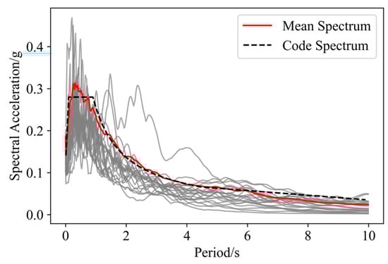 To accurately simulate the dynamic response of the structure under earthquakes, GMs input in this structure are carefully curated, comprising both natural and artificial waves. These waves are closely matched with the seismic response spectrum of Shanghai, the geographic locus of the building, considering the region’s unique soil conditions. To meet the data-intensive demands necessary for achieving high accuracy with ML models, our dataset integrates specified earthquakes from the Shanghai building code with additional selections from the Pacific Earthquake Engineering Research Center (PEER) database. This strategic combination yields a robust dataset of 42 GMs, ensuring the representation of seismic activity relevant to Shanghai’s context.