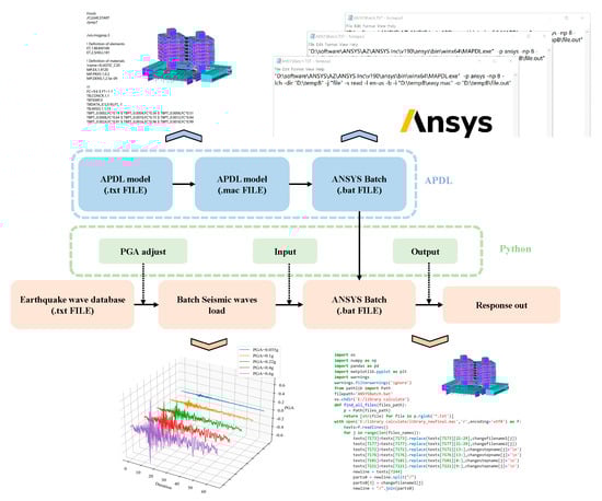 Figure 3 delineates the workflow of programmatic batch variable parameter calculation and the corresponding response output process orchestrated through the integration of APDL and Python. APDL is a function provided by ANSYS software version 2020 R2 to analyze in the form of command flow, which is a scripting language similar to FORTRAN for automatically analyzing common structures or changing parameters for rapid modeling []. The workflow is visually represented with the orange column illustrating the primary calculation procedure, while the blue and green columns distinctly highlight the processes executed via APDL and Python, respectively. This automated procedure enhances the efficiency and speed of the calculations and the generation of fragility curves, representing a significant improvement over the conventional approach of manual inputs through the ANSYS GUI and manual PGA adjustments.