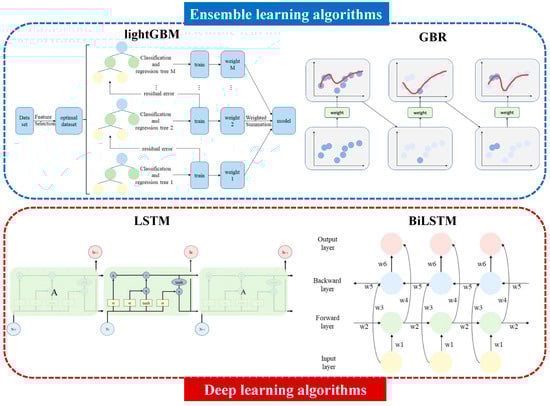 On the ensemble learning front, the LightGBM and GBR algorithms are incorporated due to their distinct merits in handling large-scale data and achieving high prediction accuracy. LightGBM stands out as a lightweight, yet powerful, optimization algorithm within the gradient boosting decision tree framework, celebrated for its swift calculation speed, minimal memory requirement, and superior calculation accuracy []. Concurrently, the GBR algorithm is recognized for its excellent regression capacity and outstanding generalization capability, attributed to the applied boosting strategy []. These ensemble methods complement the deep learning models by enriching the model’s ability to interpret and predict complex patterns through a combination of multiple predictive signals. Within the deep learning category, the LSTM and BiLSTM neural network models are highlighted for their exceptional accuracy and proficiency in processing sequential or time series data. The LSTM model, with its capacity to remember long-term dependencies, and the BiLSTM, which extends this ability by incorporating information from both past and future states, are particularly advantageous for their deep structural insights into data. Figure 5 illustrates the algorithm frame diagram utilized in this study, providing a visual representation of the methodology.
