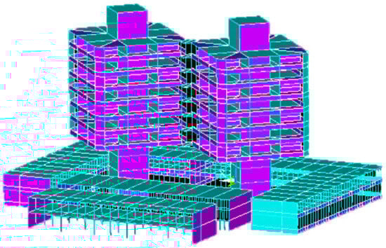 This study employs the APDL for the simulation of a high-rise reinforced concrete (RC) building, characterized by a primary tower and secondary structures, designed to accommodate a high occupancy load, tailored for library use. Following its initial construction, the building has been subject to a series of retrofitting and reinforcement strategies to meet the increased structural demands. Figure 6 shows the finite element model constructed using APDL, whereas Table 4 and Table 5 delineate the salient structural elements and their corresponding material properties, respectively.