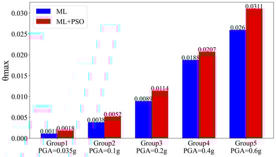 In order to quantitatively evaluate the benefits of an integrated algorithmic framework over a standalone ML algorithm, this investigation implements both methodologies to select GMs from five distinct groups of data characterized by varying PGAs. The criterion for selection is the elicitation of maximum inter-story drift. The GMs identified by each algorithm as inducing the greatest inter-story drift are then subjected to finite element analysis to compute their precise displacement values. Figure 7 provides a visual representation of these values to show the differences. It is observed that the integrated algorithms of PSO and ML significantly enhance the precision in selecting GMs that are likely to cause the maximum inter-story drifts. This improvement in accuracy is crucial for avoiding the underestimation of EDPs linked to GMs capable of inducing significant structural responses, thereby advancing the overall safety assessment.