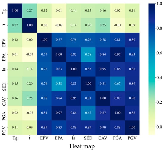 Data and features determine the upper bound of ML, while models and algorithms only approach this upper bound. Table 3 enumerates the characteristic values of GMs, which are widely regarded as representative of the input GM features, after employing the backward elimination method in the research []. As the maximum inter-story drift is reckoned as EDP in this study, it is selected as the predicted value. Through ML, the maximum inter-story drift is predicted according to the characteristic values of GMs.